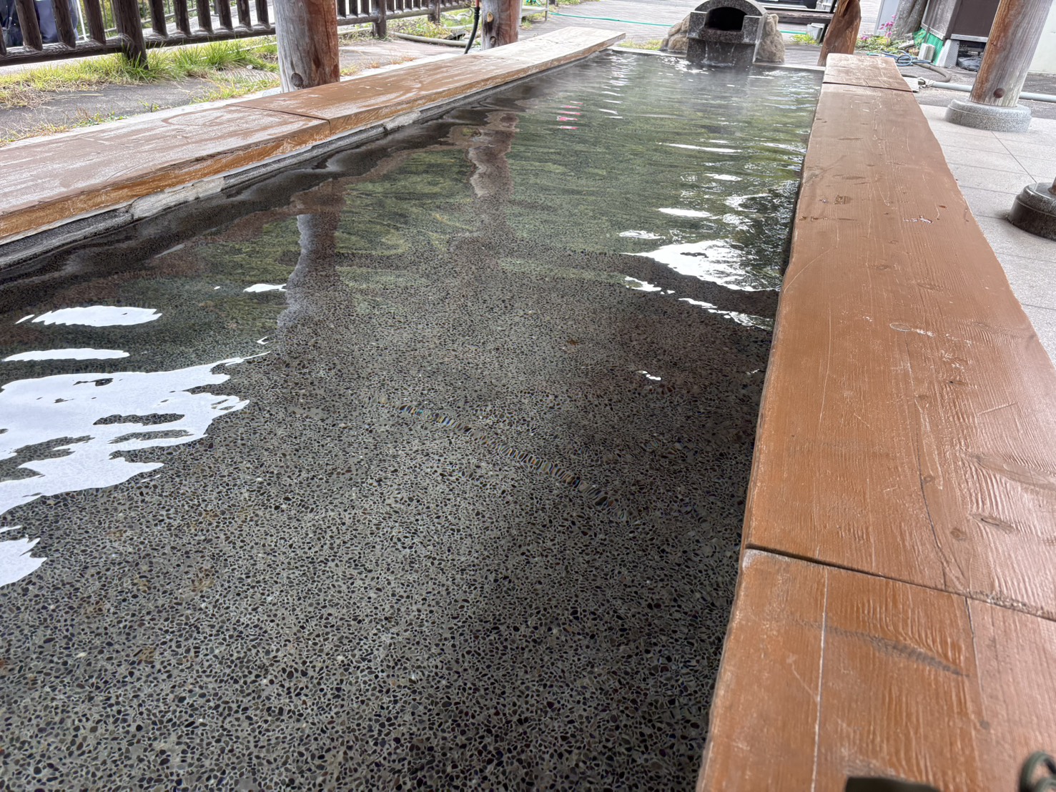 つり橋から建物に向かう途中、「足湯」がありました。かなりの長さがある足湯で、端から源泉が注がれており、反対側から流れ落ちている様子でした。源泉から離れた場所に、2~3人足をつけていましたが、ガラガラに空いている状況でした。