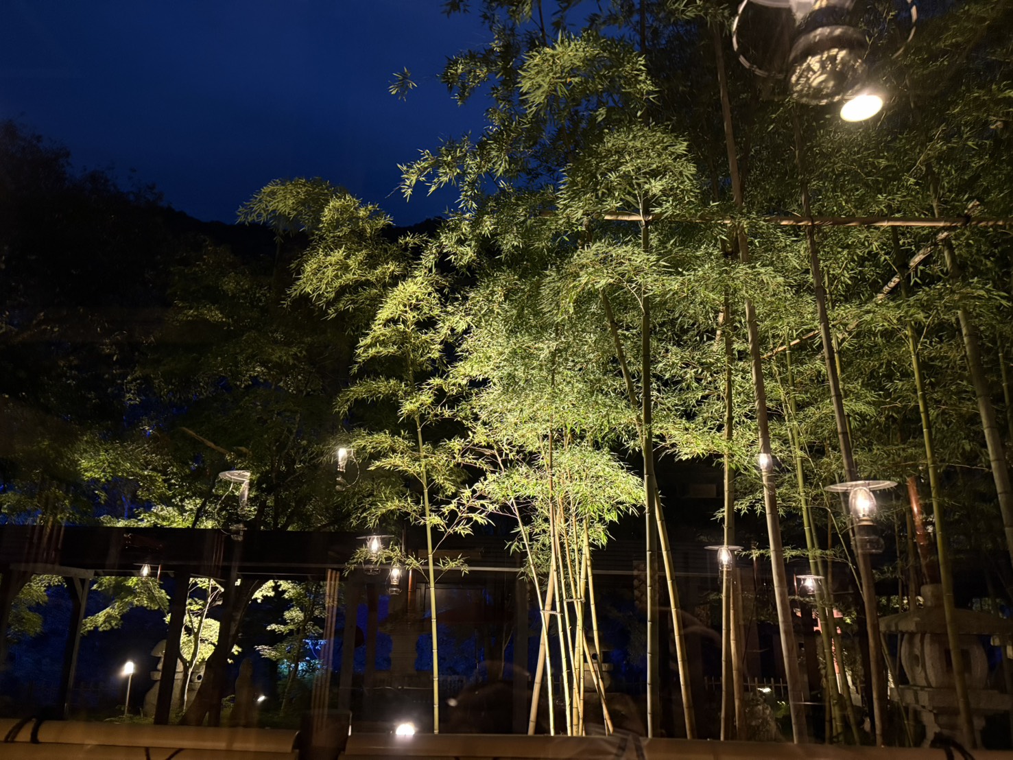 案内してくれたのは、窓際の一番景色の良い場所でした。二人で並んで、外を見ながら食事をすることができました。食事をする頃には、十分に日も暮れて、ライトアップされた幻想的な世界が広がっていました。