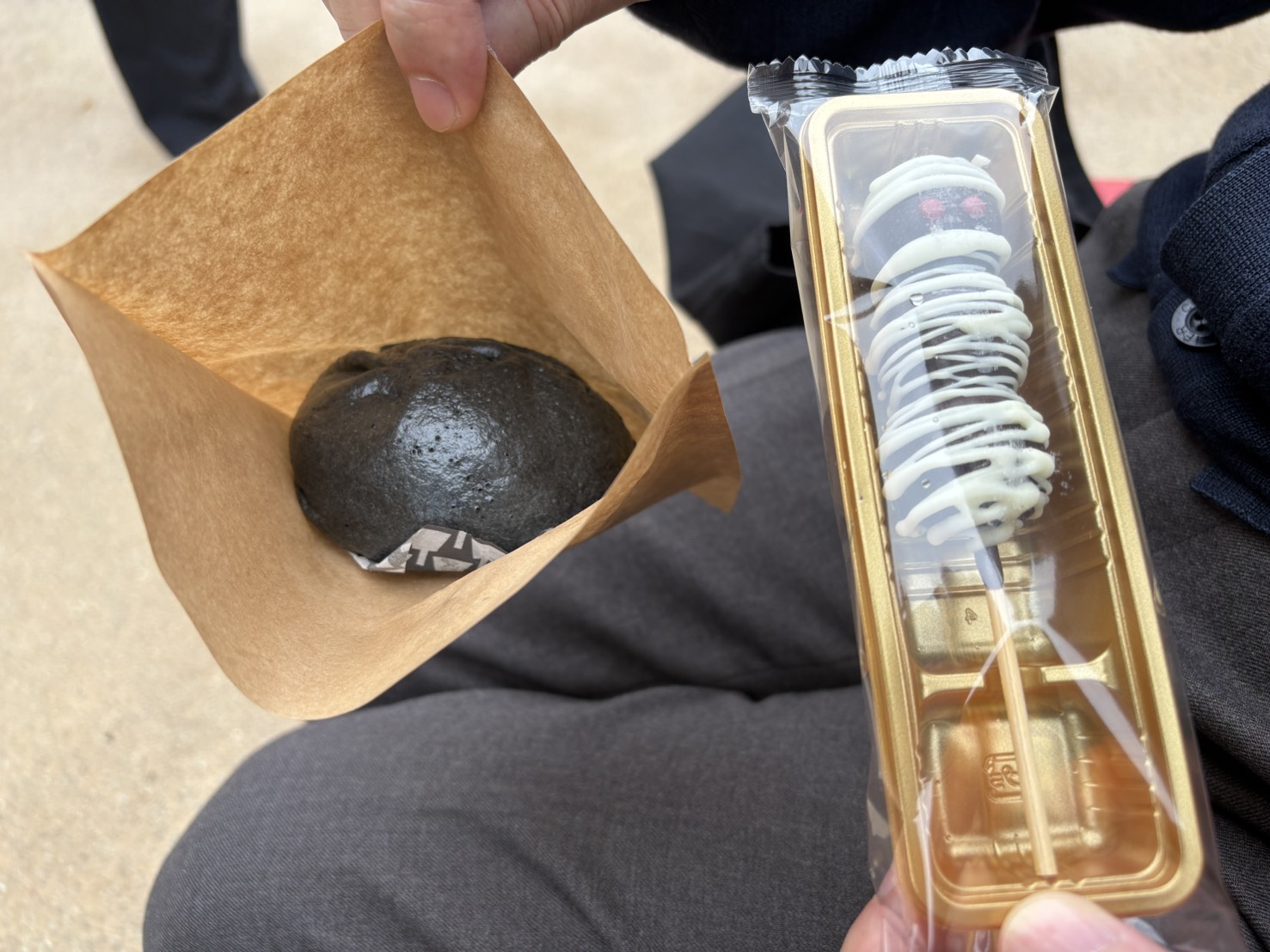 お互い、家族や職場にクッキーなどを購入しました。そして、彼女がお気に入りの「ニャンまげ」のストラップをお揃いで買ってくれました。