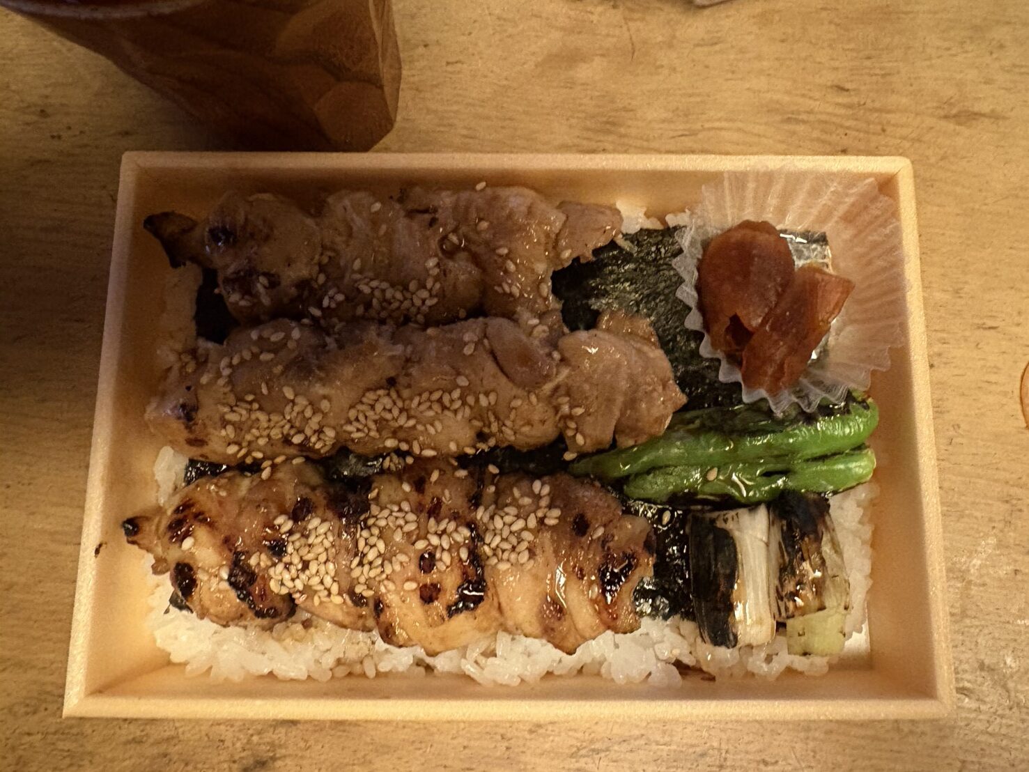 すべての劇も鑑賞して、お腹もすいてきました。どこで食べるか迷いましたが、偶然、通りかかったお店で、焼き鳥弁当をいただくことにしました。