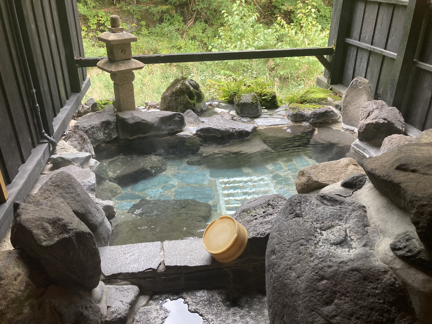 旅の疲れもあり、少し、部屋でごろごろしてから、早速、露天風呂に行ってみることにしました。目指すは、一番奥にある露天風呂でしたが、残念ながら3つとも先客がいました。そこで、手前にある露天風呂に入ることにしました。