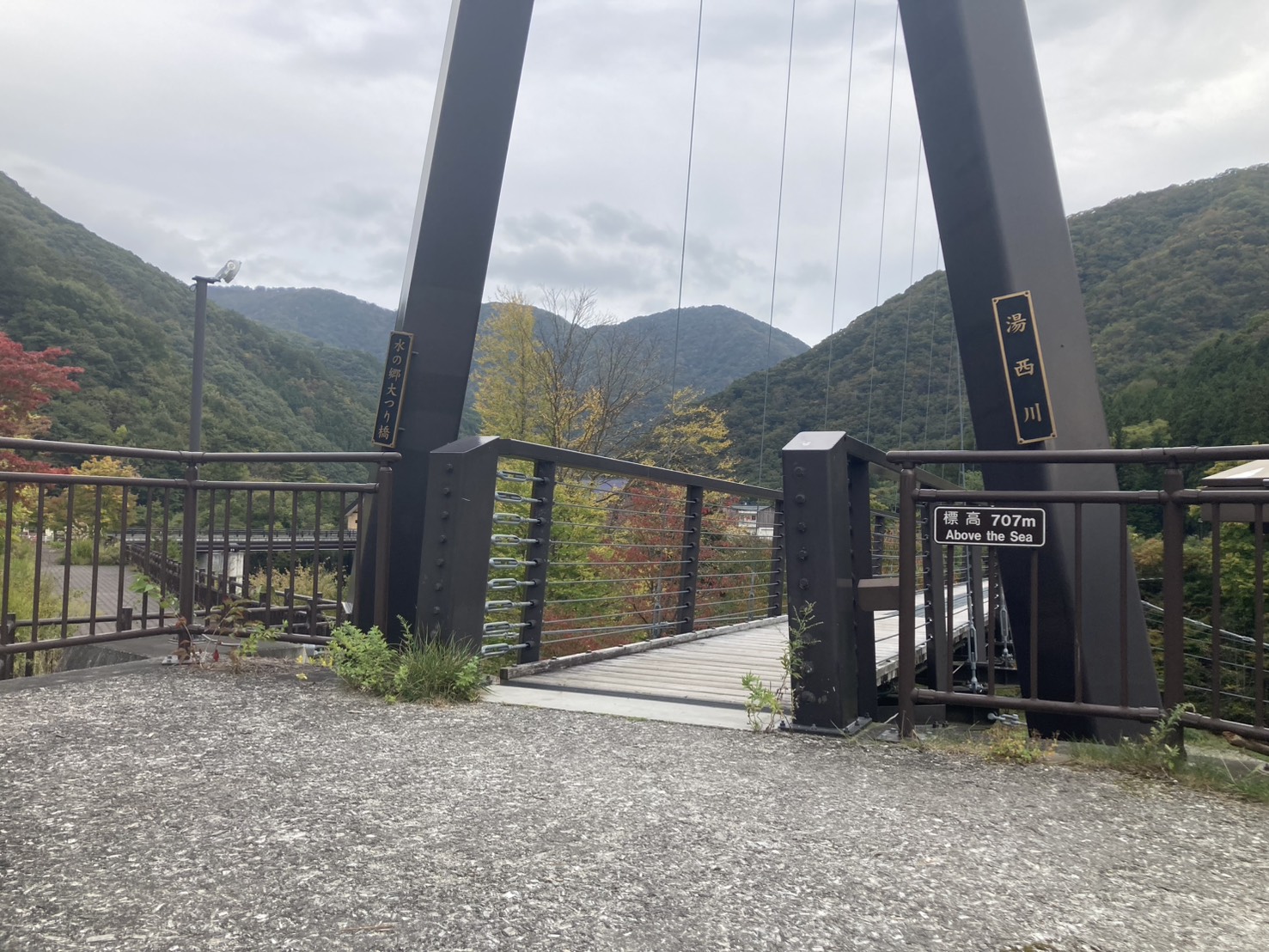 駐車場からは、かなり大きなつり橋が見えていました。早速、渡ろうといってみました。最近流行りですが、この橋の歩くところの中央部分が透明になっていて、下を見ることができます。風で揺れることもあり、怖くて中ほどで引き返してきました。橋から見る景色は、とても素晴らしかったです。