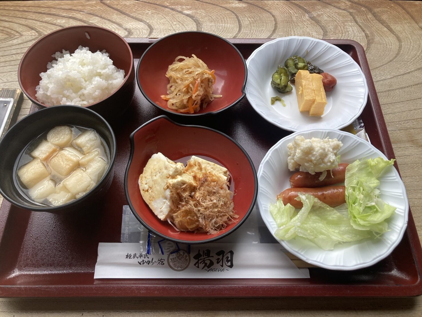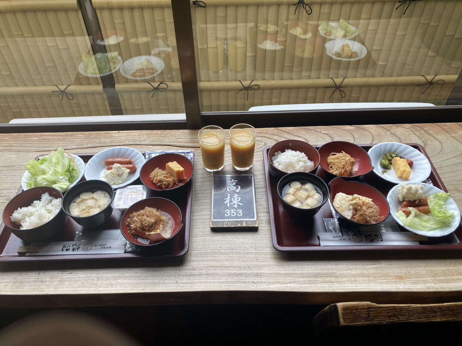 食事は、7時からだったので、少し眠かったですが、早めに食堂に向かいました。昨晩遅く、食べたのでお腹が空いていなかったのですが、いざ、並んでいるおかずなどを見ていたら、どれもこれも食べたくなり、気付いたら、かなりの量をお盆に載せていました。
